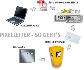 PixelLetter ist eine Schnittstelle zwischen Ihrem PC und der realen Briefpost. Sie übermitteln uns online Ihren Brief, wir drucken, falzen, kuvertieren, frankieren und versenden ihn innerhalb von 24 Stunden.